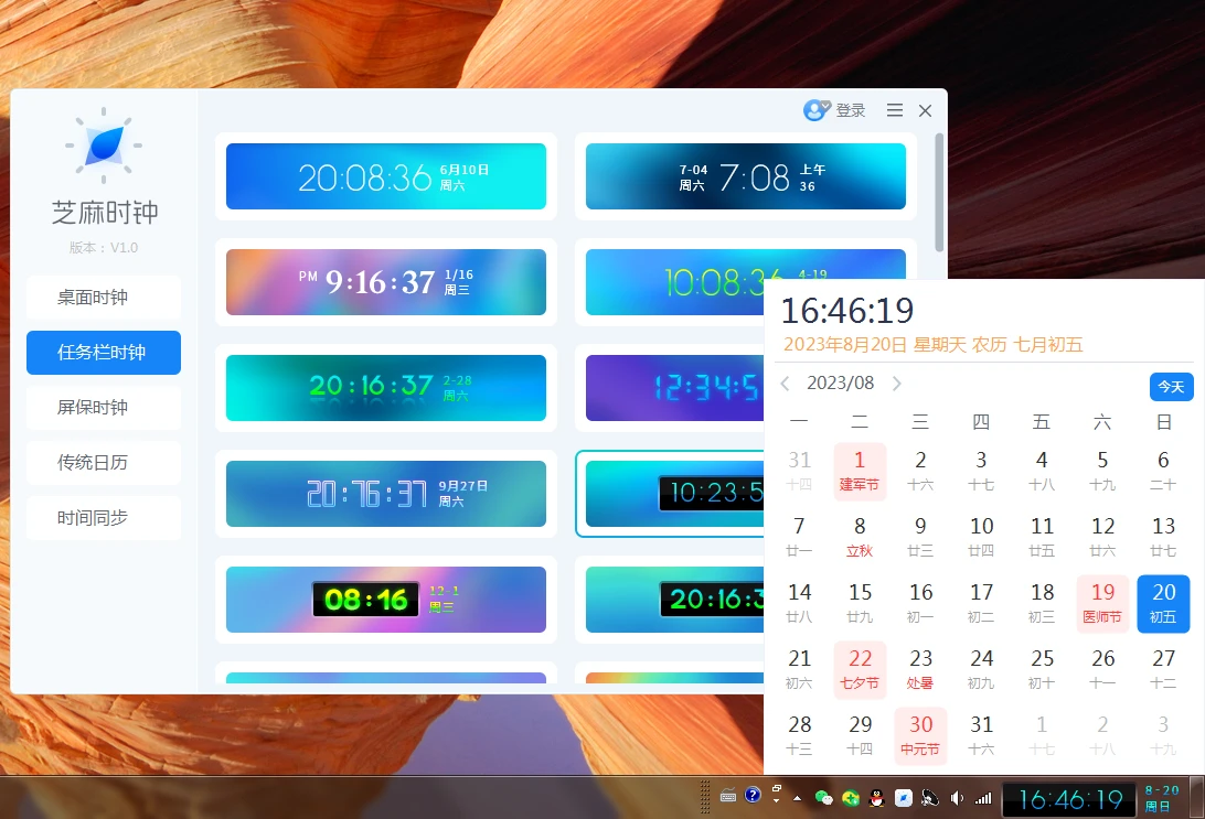 《芝麻时钟》不仅可以设置电脑时钟屏保,还可以在任务栏右下角放一个美观的个性化的时钟和日历,这样方便你看时间,如下图: