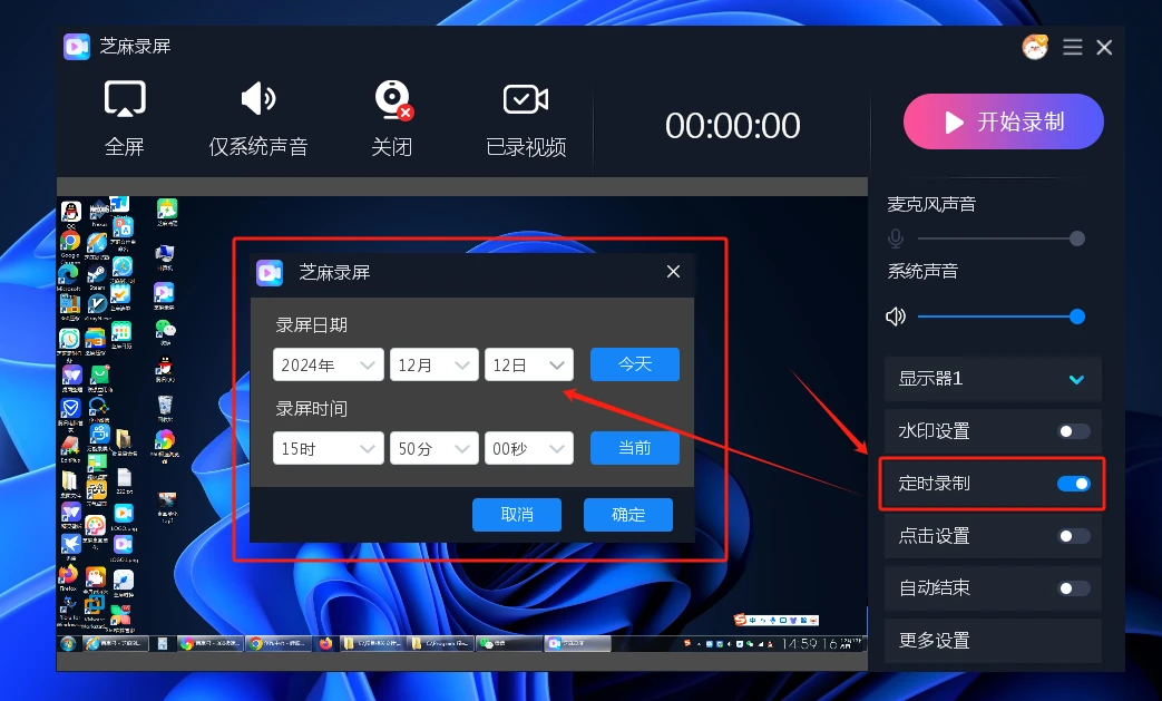 第二步:设置定时录屏,在芝麻录屏主界面,您需要找到定时录屏的设置选项。具体操作步骤如下:点击软件界面上方的“设置”按钮,进入设置界面。设置好需要录屏的日期和时间,如果我们在今天某个时间段录制,就设置今天的时间。