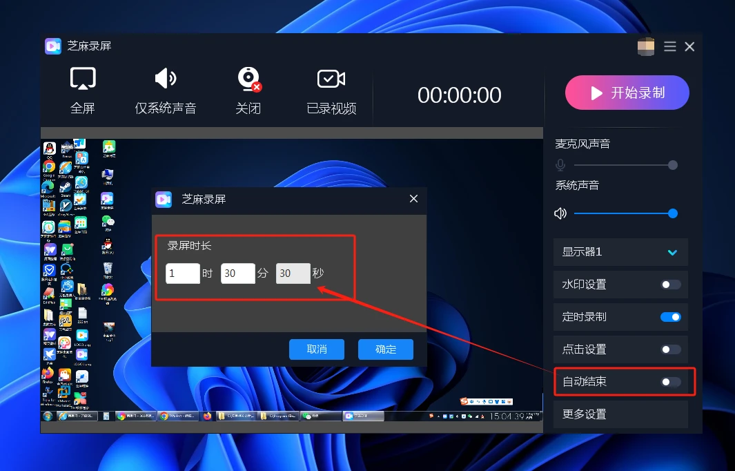 如果我们需要设置结束这个录屏,可以在自动结束这里设置一个时间,比如我们需要录制1小时30分30秒,如下图的设置: