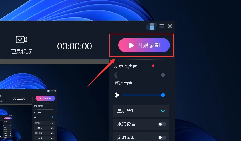 声音录制操作方法,录制视频时候,对于声音的选择也是很简单的,在顶部第二个功能图标这里,可以选择麦克风声音、系统声音、系统和麦克风声音、不录声音。