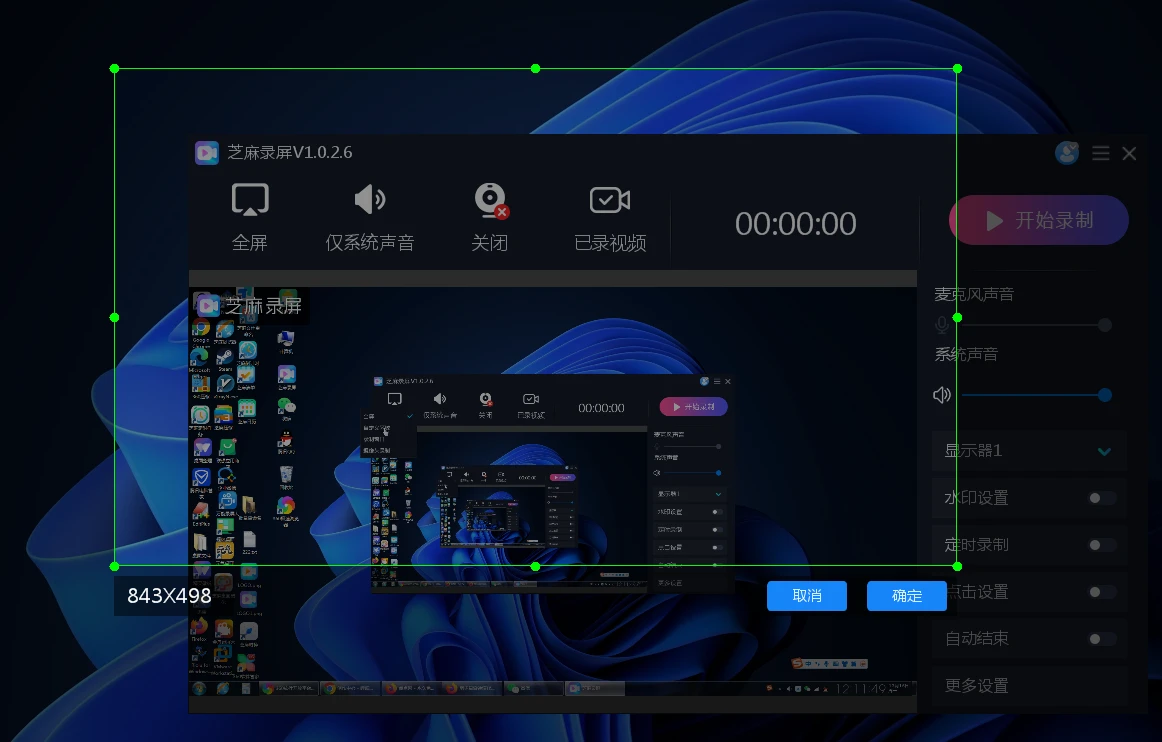 屏幕上就出现一个绿色的区域,按住鼠标左键拖动,选择我们需要的位置,确定好区域之后,点击右下角的确定按钮,就完成自定义区域选择,然后就可以开始录制了。