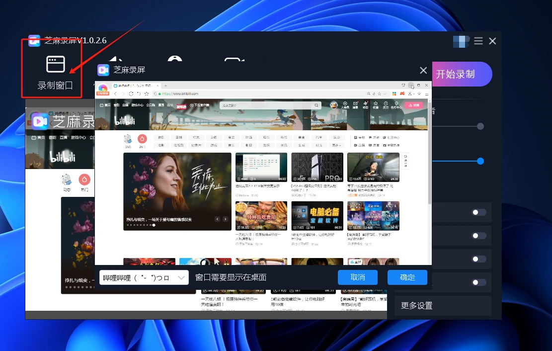 窗口录制操作方法,点击左上角,切换成窗口录制模式,然后选择窗口,比如我们选择了浏览器的窗口,选择好窗口后,就可以开始录制。