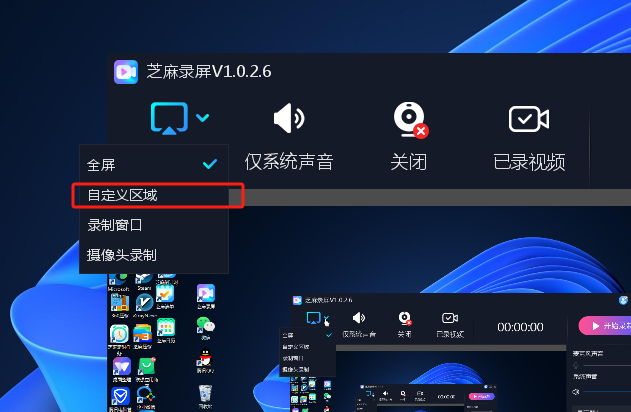 自定义区域录屏操作方法,当然了,有些人可能不需要全屏录制,只需要录制指定的区域,这个也是可以的,先点击左上角的菜单,选择“自定义区域”,如下图: