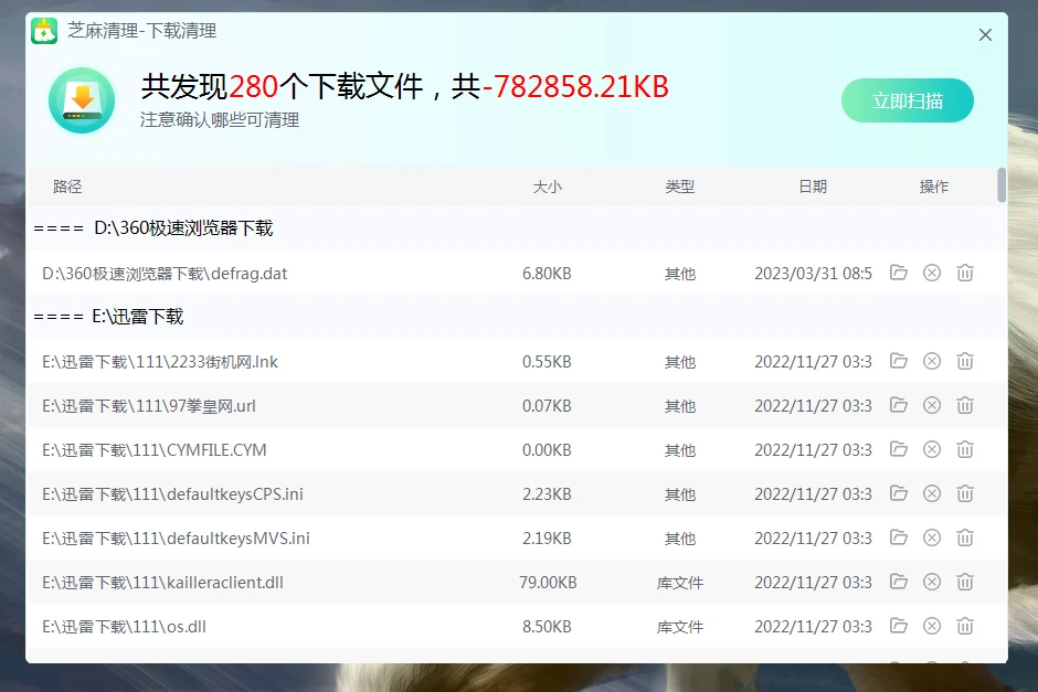 下载文件长期不清理,积累起来也是一个很大的空间占用,用芝麻清理这个工具去分析历史下载的文件记录,可以找到被你遗忘的文件,可以把不需要的文件都清理掉,释放更多空间;
